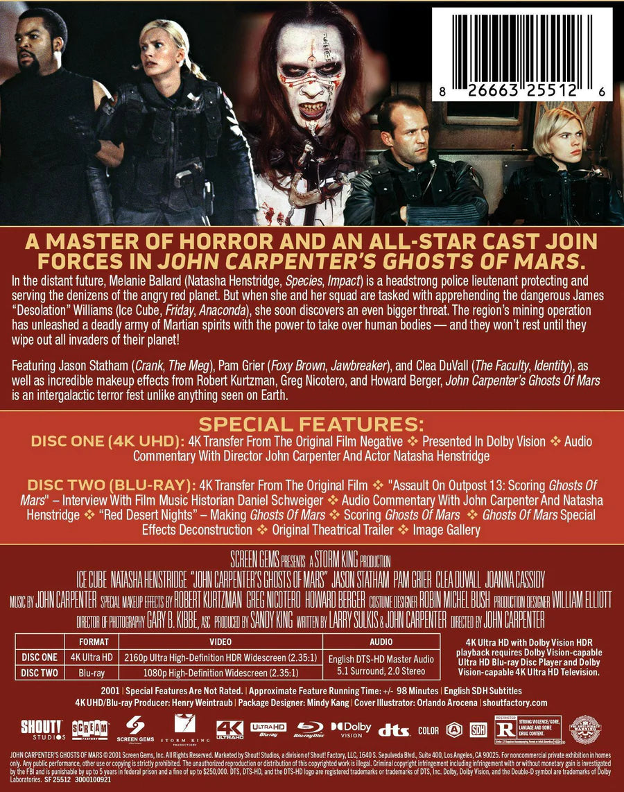 By the year 2176, the planet Mars, long inhabited by human settlers, has become the manifest destiny of an over-populated Earth. Nearly 640,000 people now live and work all over Mars, mining the planet for its abundant natural resources. But one of those mining operations has uncovered a deadly mother lode: a long dormant Martian civilization whose warriors are systematically taking over the bodies of human intruders. Lt. Melanie Ballard (Natasha Henstridge, Species) of the Martian Police Force is on transport assignment to bring James "Desolation" Williams (Ice Cube, 21 Jump Street), the planet's most notorious criminal, to justice. Williams has no plans to make Ballard's job easy. What begins as a battle of force and wits between cop and criminal soon turns into something more fundamental: a battle for human survival in the realm of the Martian warriors. It's civilization against civilization as Ballard and Williams join forces in mortal combat with the Ghosts of Mars.
