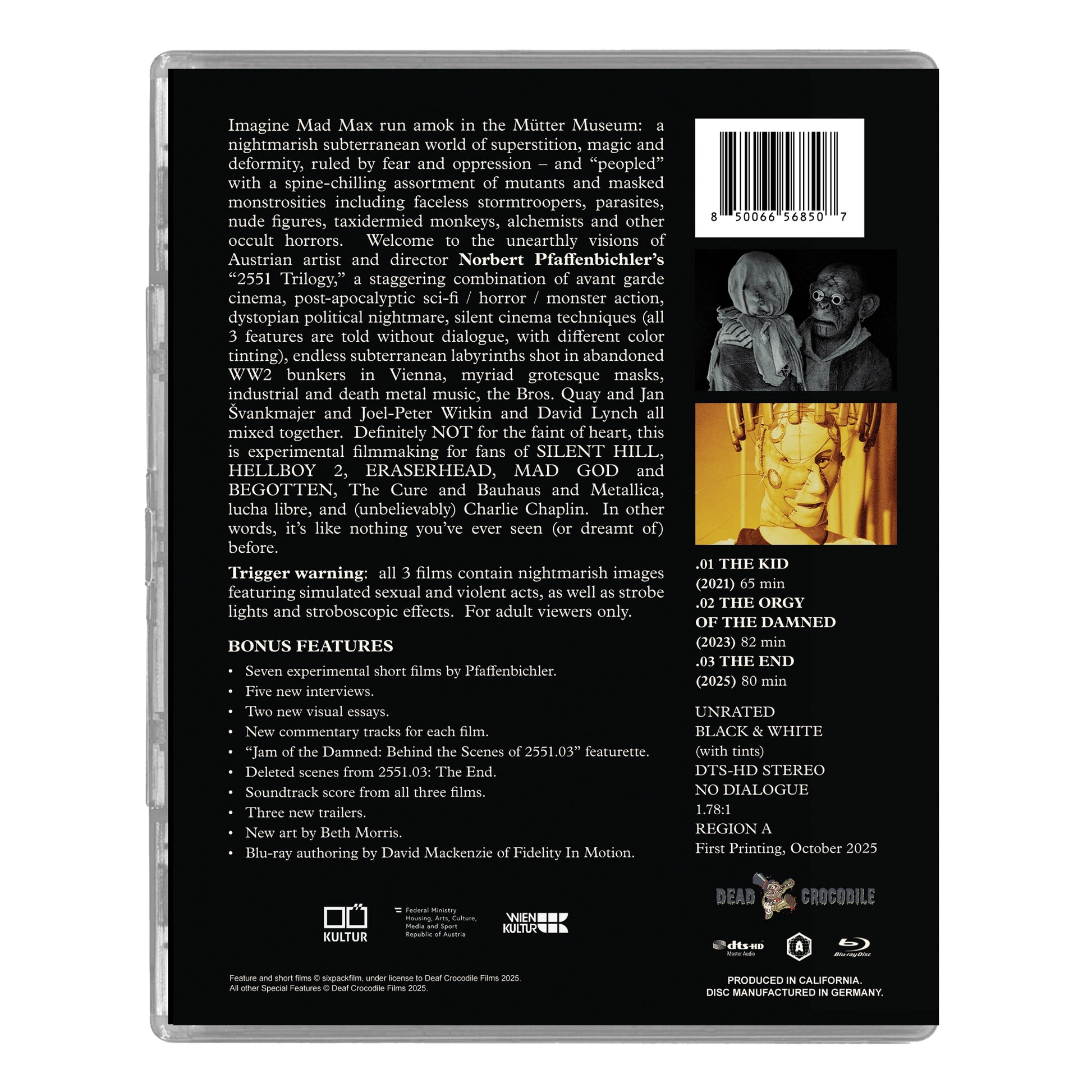 Imagine Mad Max run amok in the Mütter Museum: a nightmarish subterranean world of superstition, magic and deformity, ruled by fear and oppression - and "peopled" with a spine-chilling assortment of mutants and masked monstrosities including faceless stormtroopers, parasites, nude figures, taxidermied monkeys, alchemists and other occult horrors. Welcome to the unearthly visions of Austrian artist and director Norbert Pfaffenbichler's "2551 Trilogy," a staggering combination of avant garde cinema, post-apocalyptic sci-fi / horror / monster action, dystopian political nightmare, silent cinema techniques (all 3 features are told without dialogue, with different color tinting), endless subterranean labyrinths (shot in abandoned WW2 bunkers in Vienna), myriad grotesque masks, industrial and death metal music, the Bros. Quay and Jan Švankmajer and Joel-Peter Witkin and David Lynch all mixed together. Definitely NOT for the faint of heart or easily offended, this is experimental filmmaking for fans of SILENT HILL, HELLBOY 2, ERASERHEAD, MAD GOD and BEGOTTEN, The Cure and Bauhaus and Metallica, lucha libre, and (unbelievably) Charlie Chaplin. Includes: 2551.01 - THE KID (2021, 65 min.) + 2551.02 - THE ORGY OF THE DAMNED (2023, 83 min.) + 2551.03 - THE END (2025, 82 min.)Media