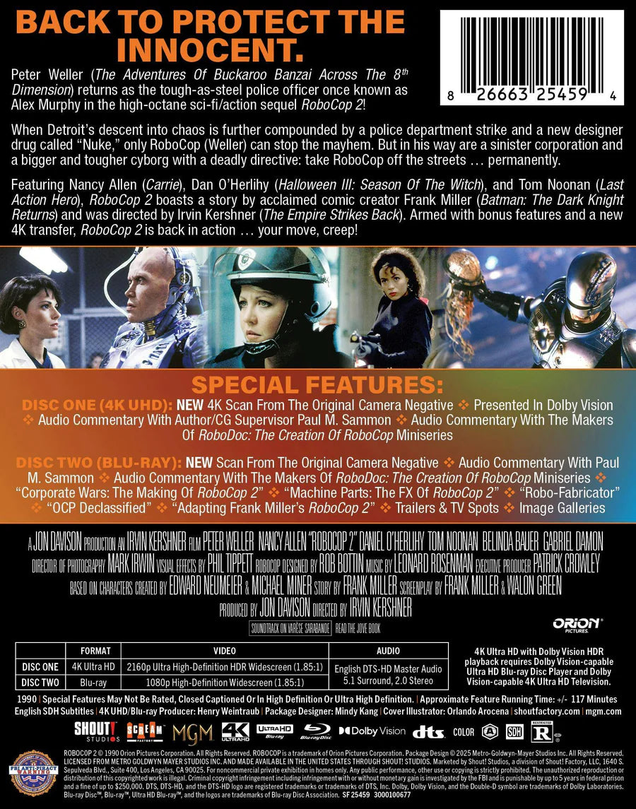 When Detroit's descent into chaos is further compounded by a police department strike and a new designer drug called "Nuke," only RoboCop can stop the mayhem. But in his way are an evil corporation that profits from Motor City crime and a bigger and tougher cyborg with a deadly directive: Take out RoboCop. Containing the latest gadgetry and weaponry as well as the mind of the madman who designed "Nuke," this new cyborg isn't just more sophisticated than his predecessor…he's psychotic and out of control! And it's going to take everything RoboCop has—maybe even his life—to save Detroit from complete and utter anarchy.